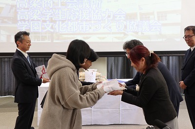 11月14日(木)午前11時45分から順正学園で開催された贈呈式では、関係者約30人が出席、高梁商工会議所藤岡会頭(学園文化都市づくり協議会会長)の挨拶の後、高梁学生応援協力会田中宏和会長が順正学園加計勇樹理事長へ目録を手渡し、続いて同学生応援協力会月本副会長と磯村副会長が留学生にお米を手渡しました。そして最後に加計理事長から謝辞をいただき、留学生代表より謝辞がありました。