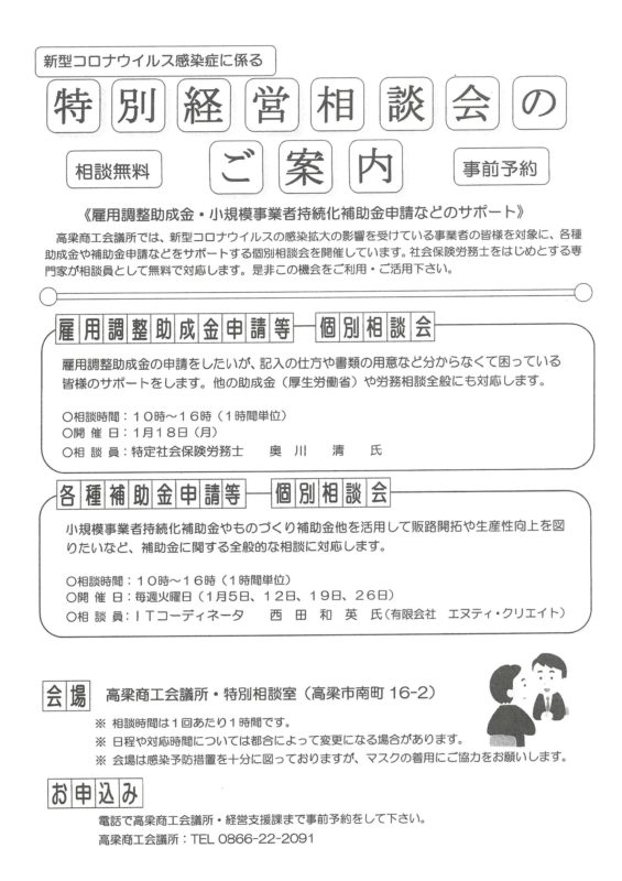 ◇雇用調整助成金 ◇各種補助金個別相談会(1月)のご案内(高梁商工会議所)