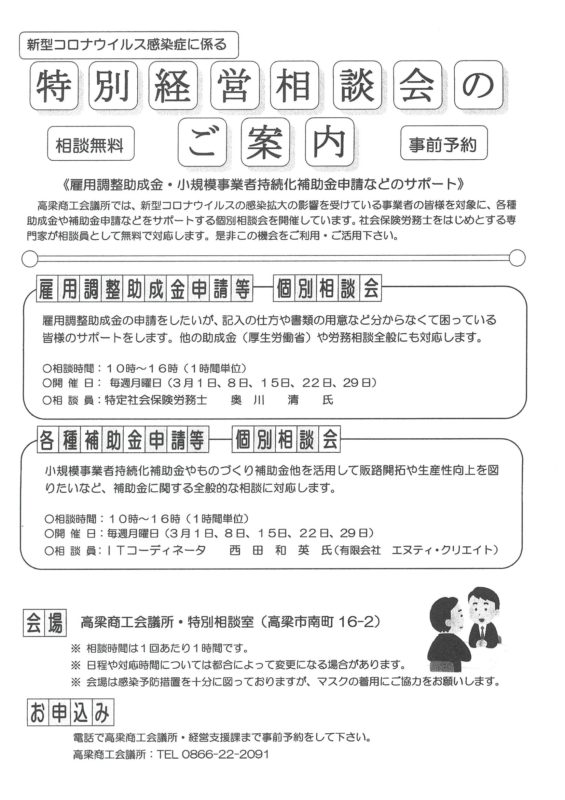 ◇雇用調整助成金 ◇各種補助金個別相談会(3月)のご案内(商工会議所)
