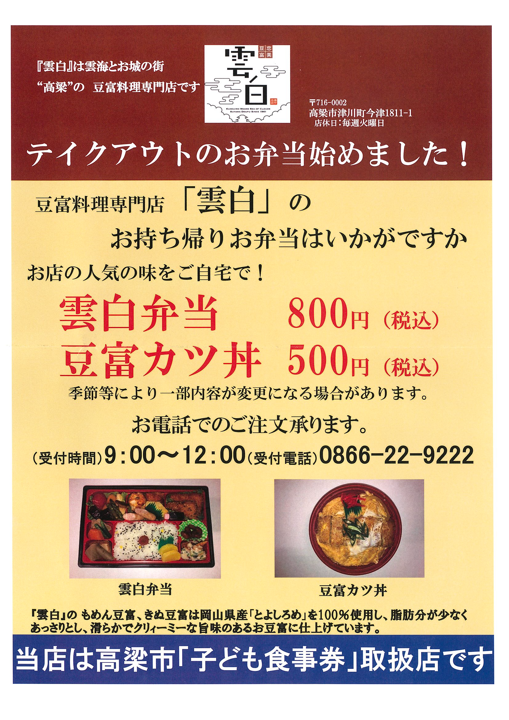 ・雲白弁当 800円 ・豆富カツ丼 500円 (各税込) |