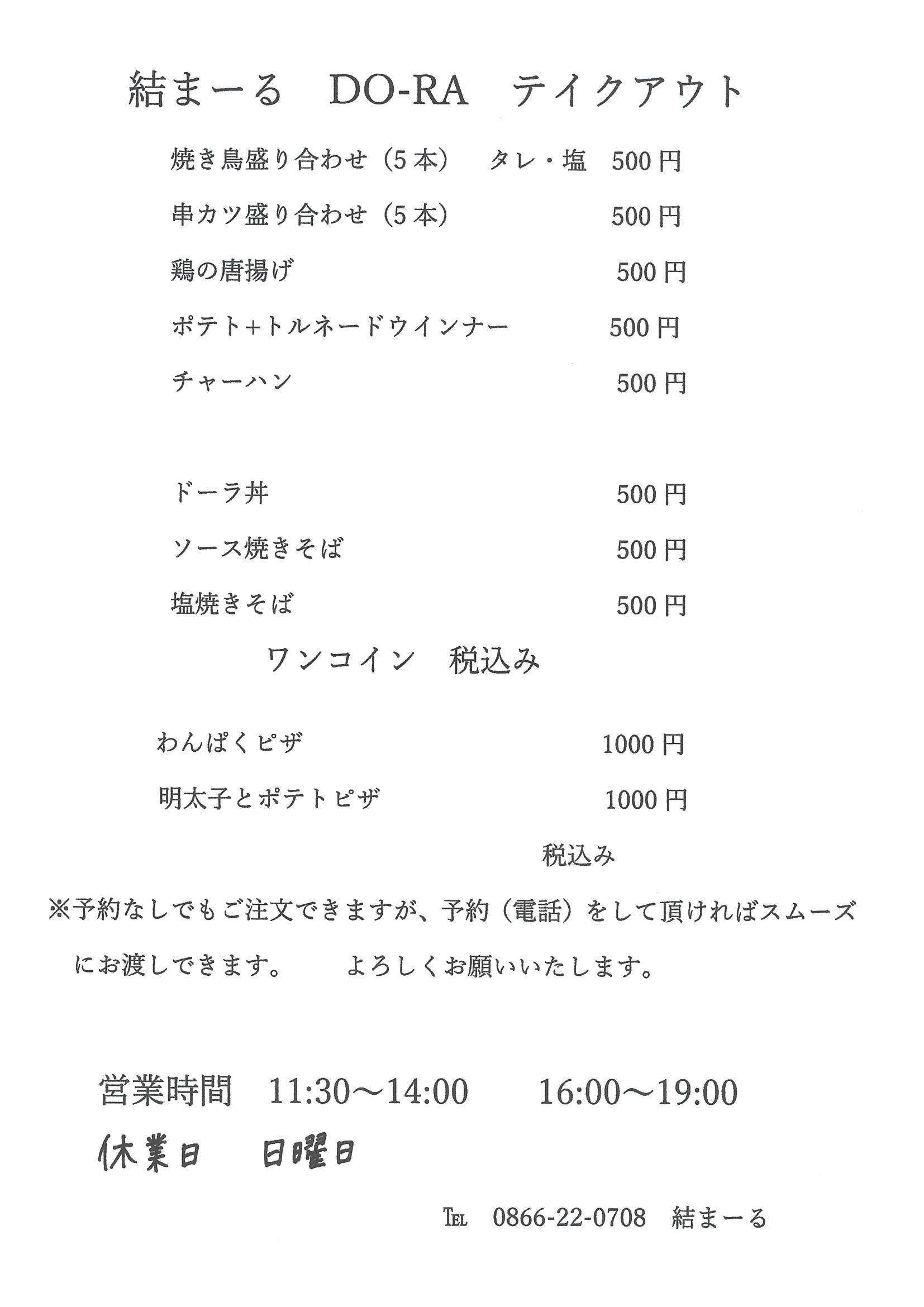 | 結まーる | 高梁市旭町1335-18 | 22-0708 | 日曜日 | 11時30分~14時 16時~19時 |