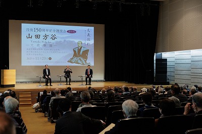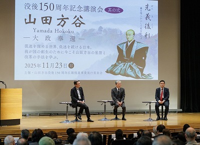 山田方谷没後150周年広報推進事業実行委員会(事務局・岡山商工会議所)では、山田方谷没後150周年記念講演会(其の弐)を、11月23日㈰に山陽新聞社さん太ホール(岡山市)で開催いたしました。講演会は5月に続いて2回目の開催で、同実行委員会松田久会長((一社)岡山県商工会議所連合会会長)の挨拶の後、〇徳川斉正氏(江戸幕府15代将軍徳川慶喜の曾孫)が「大政奉還と徳川慶喜」について、〇方谷直系子孫の野島透氏が「老中顧問としての方谷の足跡」について、〇就実大学名誉教授杉山慎策氏が「大政奉還建白書から大政奉還上奏文」についてそれぞれのテーマで講演された後、3人による鼎談が行われました。実行委員会には高梁商工会議所も参画しています。