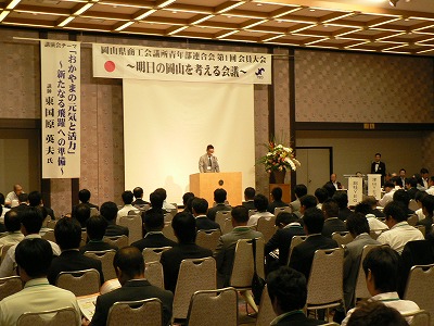 「岡山県商工会議所青年部連合会・第1回会員大会」が、6月30日(土)に岡山ロイヤルホテルで開催され、高梁商工会議所青年部(高梁YEG)から13人が登録・参加いたしました。式典の後3会場に別れ分科会が開催され、「元気!輝く中山間地域活性化プロジェクト」をテーマとした第1分科会には、高梁YEG平松久幸会長もパネリストとして参加されました。続いて、前宮崎県知事・東国原英夫氏をお招きしての講演会やビジネス交流会、大懇親会が行われ、県内商工会議所青年部のメンバー同士交流を深めました。
