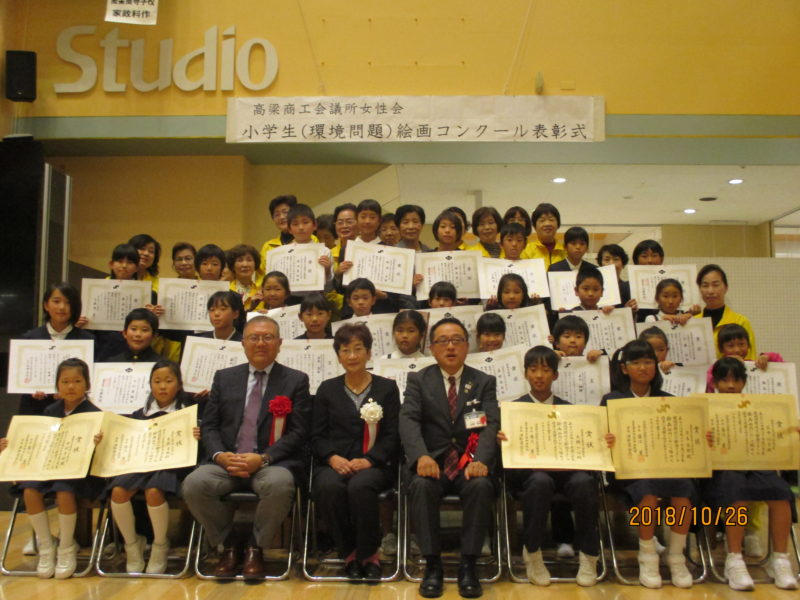 高梁商工会議所女性会では、10月26日(金)午後5時よりポルカ天満屋ハピータウンで、『小学生(環境・ゴミ・省エネルギー問題)絵画コンクール』表彰式を開催いたしました。環境問題を考える機会を与えることを目的に毎年市内の小学生より絵画を募集し、優秀な作品を表彰しており、今年は市内10校より118点の応募があり、厳正な審査の上優秀な作品30点を選出し、高梁商工会議所女性会津野邊会長、高梁市近藤市長、高梁商工会議所藤岡会頭より参加した受賞者へ賞状と記念品を授与いたしました。