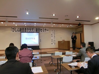 びしん経営者クラブ「経営セミナー・情報交換会」が、3月14日(木)午後6時から新見商工会議所開催されました。当日は会員、備北信用金庫役職員等50人が出席、びしん経営者クラブ島 一郎会長、備北信用金庫岡田専務理事の挨拶の後、経営セミナーが開催され、講師にお招きした(株)スマイル・ラボ代表取締役 難波治彦氏より「人手不足を解決する〈働き方改革〉」をテーマに講演をいただきました。終了後引き続き情報交換会が行われ、参加者同士交流を深めていました。