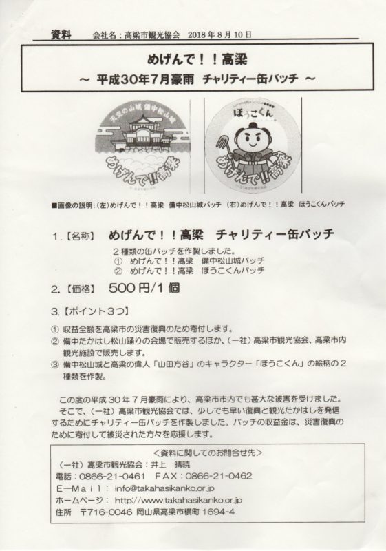 めげんで!! 高梁 平成30年7月豪雨チャリティー缶バッチを販売(高梁市観光協会)