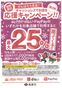 キャッシュレスでお店を応援キャンペーンのご案内(2月1日~2月15日)