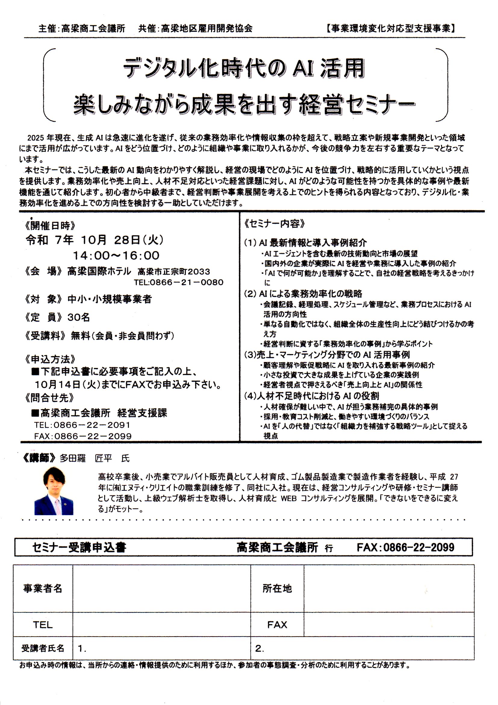 デジタル化時代のAI活用 楽しみながら成果を出す経営セミナーのご案内