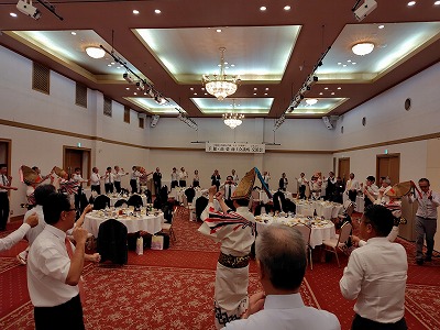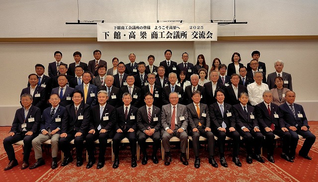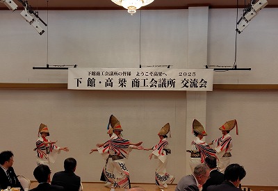 下館商工会議所(茨木県筑西市)の一行24人が、創立70周年記念の一環として10月2日(木)に高梁市を訪問されました。今回は、平成27年に訪問されて以来10年ぶりの来高で、一行は午後2時から①備中松山城コース、②城下町散策コースに分かれ市内観光を楽しまれました。引き続き午後6時から高梁国際ホテルで、「下館・高梁商工会議所交流会」を開催いたしました。交流会には、両商工会議所から役員・議員・青年部等50人が出席、高梁商工会議所藤岡会頭、下館商工会議所中野会頭の挨拶、石田高梁市長の来賓挨拶の後、高梁市議会伊藤議長の乾杯で懇親会が行われ両市の商工会議所同士交流を深めました。最後に踊りフレンズによる「備中たかはし松山踊り」を披露、参加者と一緒に松山踊りを体験し楽しんでいただきました。(高梁市は昭和54年に旧下館市と友好都市提携を締結、合併後の筑西市とは平19年に締結しています。)