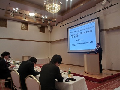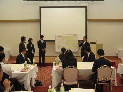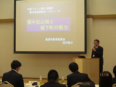 中国ブロック商工会議所観光推進研修会(日本商工会議所・中国地方商工会議所連合会主催)を、11月19日(月)、20日(火)の2日間、高梁国際ホテル等で開催いたしました。初日19日(月)午後1時30分から開催した研修会には、中国地方5県の商工会議所等から約25人が出席、地元高梁商工会議所遠藤専務理事の挨拶の後、日本商工会議所観光専門委員会須田寛学識委員より「観光立国の課題」をテーマに講演をいただき、日本商工会議所地域振興部竹ノ内典子主席調査役より「観光振興における商工会議所の役割」について説明をいただきました。続いて中国運輸局観光部木島淳部長より中国地方の観光振興を目指して」をテーマに講演をいただいた後、地元高梁市教育委員会田村啓介参与(元岡山県立博物館長)より「備中松山城と城下町の魅力」をテーマに講演をいただきました。その後、日本商工会議所竹ノ内主任調査役の進行で4班に分かれ「インバウンドを呼び込む広域観光商品を創る」をテーマにワークショップを行い、各班ごとに発表が行われ中国運輸局木島観光部長から講評をいただきました。また、午後6時15分から懇親会を開催し、参加者同士交流を深めていました。(20日(火)の視察は次回アップします)