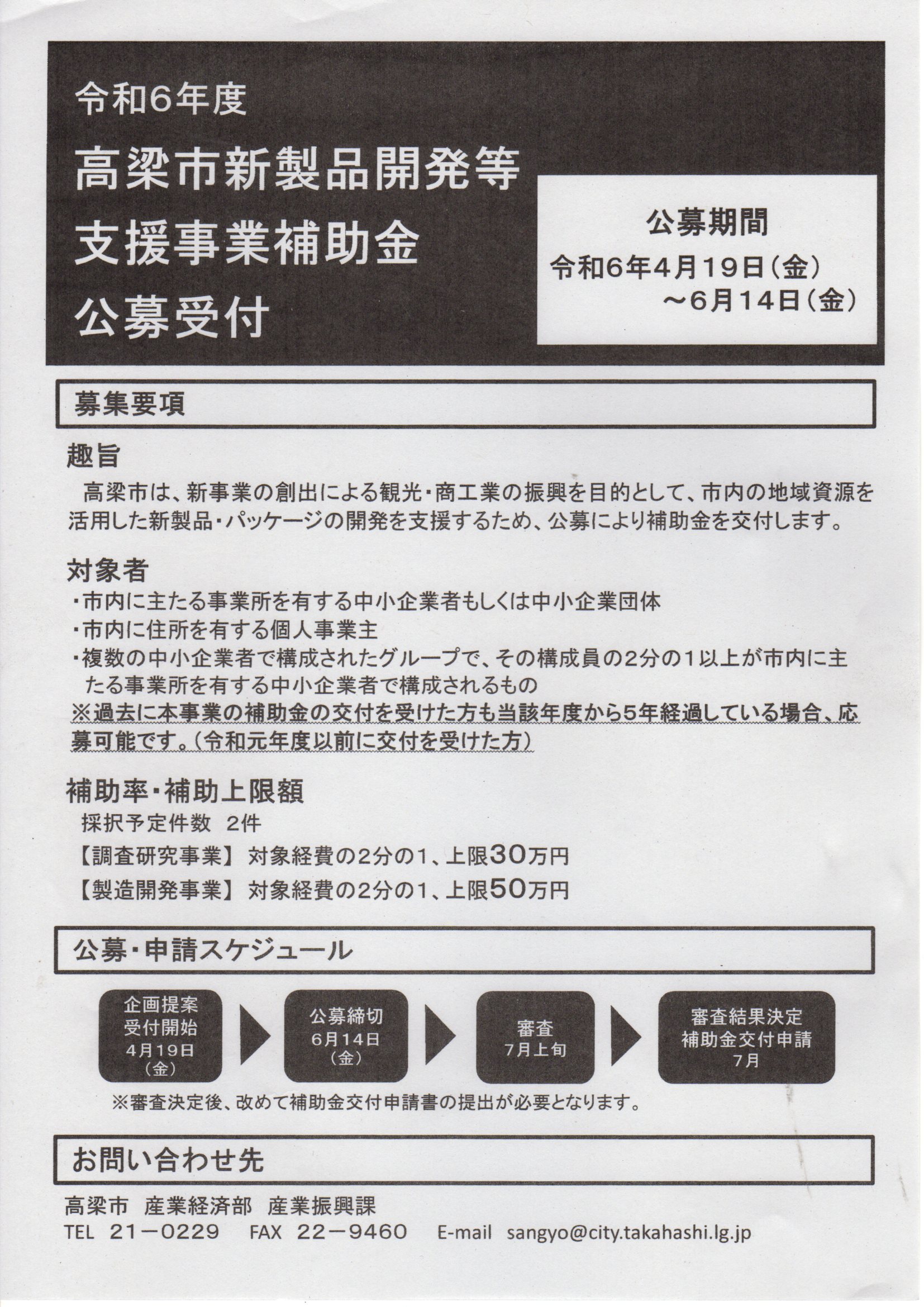 > 令和6年度高梁市新製品開発等支援事業補助金公募受付のご案内