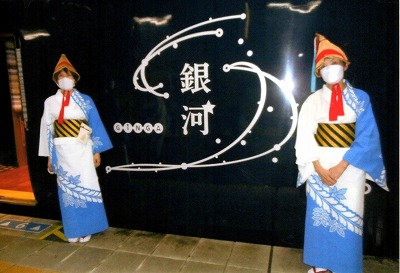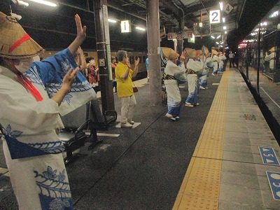 JR西日本では京都・大阪~出雲間(伯備線経由)に、岡山ディスティネーションキャンペーンの一環として5月6日(金)から9月21日(水)までの期間、新型観光列車「WEST EXPRESS 銀河」を運行されています。JR備中高梁駅には毎週水曜日と土曜日に、出雲市発の大阪行上りの「銀河」が21:25に到着、35分間停車し22:00に発車します。期間中は特産品販売、地酒の試飲、備中神楽など様々なおもてなしがおこなわれています。8月24日(水)には高梁商工会議所女性会が参加し、歓迎イベントとして備中たかはし松山踊り(岡山県指定重要無形民俗文化財)を披露いたしました。そしてプラットホームでは銀河の出発をメンバーでお見送りをいたしました。