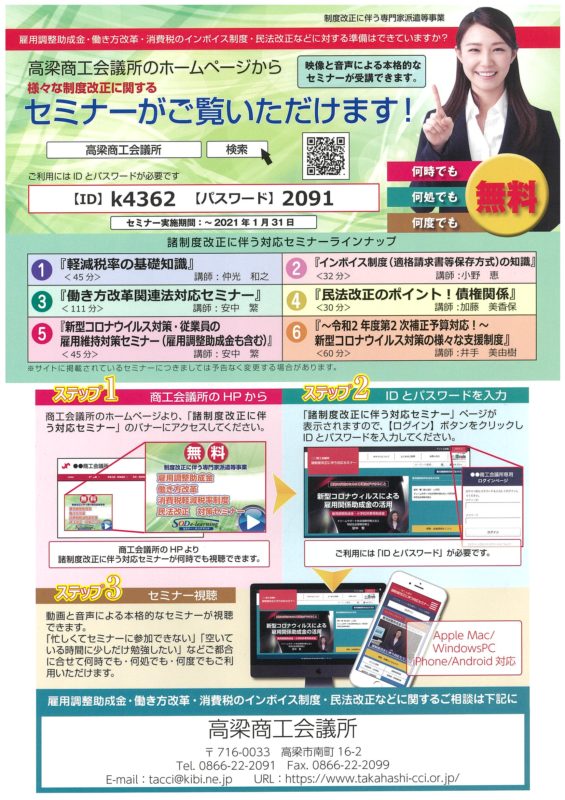 高梁商工会議所では、制度改正に伴う専門家派遣事業の一環として、令和2年11月~令和3年1月の期間、【制度改正に伴う対応(Web)セミナー】を実施いたしました。セミナーは①「軽減税率の基礎知識(45分)」、②「インボイス制度(適格請求書等保存方式)の知識(32分)」、③「働き方改革関連法対応セミナー(111分)」、④「民法改正のポイント ! 債権関係(30分)」、⑤「新型コロナウイルス対策・従業員の雇用維持対策セミナー(雇用調整助成金も含む)(45分)」、⑥「~令和2年度第2次補正予算対応!~新型コロナウイルス対策の様々な支援制度」の6項目の内容で実施いたしました。