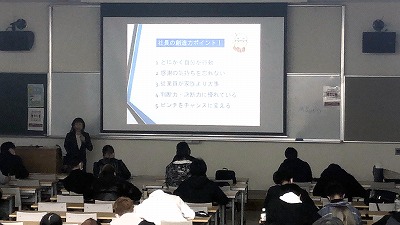 吉備国際大学社会科学部経営社会学科では、高梁学生応援協力会(田中宏和会長)・高梁商工会議所と連携し、高梁市内の経営者が大学で講義を行う「リーダーシップと経営者」を、今年10月から毎週金曜日にシリーズで開催しています。同大学経営社会学科の姜教授が昨年度から実施されているもので、11月25日(水)に吉備国際大学で開催された授業では、マイコー(株)取締役磯村尚子氏が1時間30分、講演を行われました。同講義は来年1月まで開催される計画です。