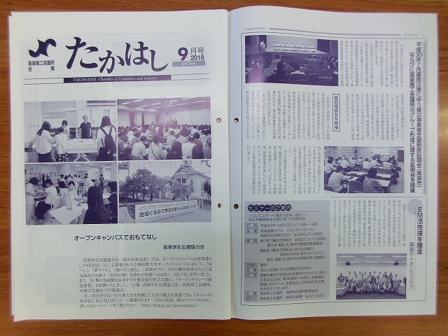 高梁商工会議所会報9月号が発行されました。表紙は、8月23日(土)に吉備国際大学で実施した、オープンキャンパス応援事業(高梁学生応援協力会・高梁商工会議所・学園文化都市づくり協議会主催)。吉備国際大学オープンキャンパスに参加された生徒の皆さんへ、備中高梁ぶらんど商品(夢ブッセ、ゆべし、極みのどら焼き他のお菓子)のでおもてなし(PRと無料配布)。2P以降に、9月3日(月)に高梁市文化交流館で開催した、平成30年7月豪雨災害に伴う被災事業者支援制度説明会(高梁市・高梁商工会議所等主催)、9月5日・6日に中国経済産業局担当者をお招きして開催した「グループ補助金個別説明会」(高梁商工会議所主催)、そして9月7日(金)に高梁総合文化会館で開催した、高梁商工会議所のグループ形成に関する説明会報告。また豪雨災害特別相談窓口開設中案内、働き方改革一括法対応「改正労働基準法・安衛法等対応セミナー」案内、東京インターナショナルギフトショー空き2018への出展支援報告(高梁商工会議所伴走型支援)、高梁ライオンズクラブEM活性液贈呈式報告(8月31日・高梁市役所)、小堀遠州の世界2018(頼久寺ガーデンコンサート・10月13日(土)、遠州茶会・10月28日(日))案内、アクサ生命保険広告、ジョブカード制度(有期実習型訓練)案内、税を考える週間案内、年末調整説明会案内、吉備国際大学まち中ゼミナール(ポルカ天満屋ハピータウン)案内、高梁市中小企業等再建補助金(7月豪雨災害向け)案内、吉備国際大学シャルム岡山高梁だより。また、マルケイ資金案内、特許商標実用新案等相談日案内、事務局日誌などです。吉備国際大学社会学部高橋ゼミと連携した取材「産学連携シリーズ」は日本貿易産業(株)飯塚社長⑩」です。またご覧下さい。