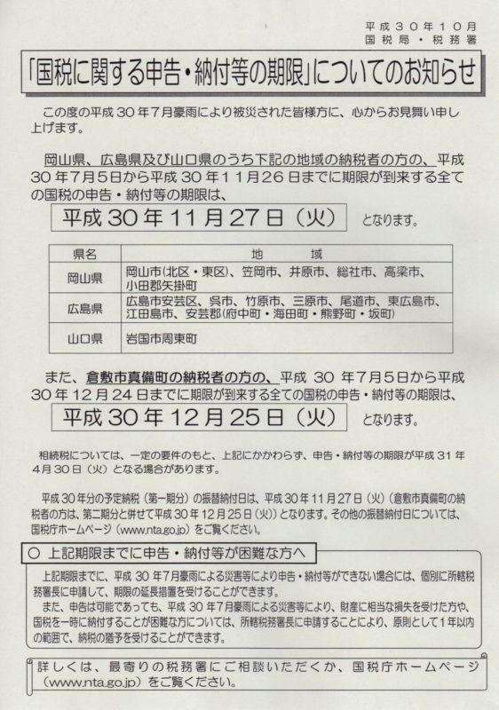 > 国税に関する申告・納付等の期限についてのお知らせ(国税局)