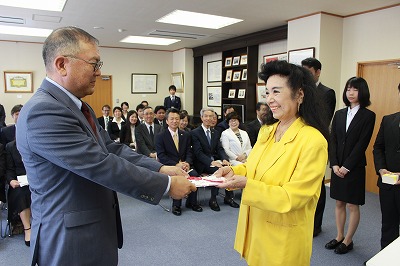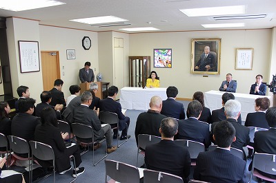 高梁商工会議所と高梁学生応援協力会では、学生生活支援事業の一環として、本年度も「学生便利手帳」を作成しました。手帳には、市の情報や観光など幅広く紹介しており、会員事業所のPRなども掲載しています。また、吉備国際大学へ入学する留学生への生活応援用品620点を準備いたしました。4月27日(金)午前11時45分から順正学園国際交流会館でおこなわれた学生便利手帳・留学生生活支援物品贈呈式には、関係者約40人が出席、高梁商工会議所藤岡孝会頭の挨拶の後、藤岡会頭から順正学園加計理事長へ学生便利手帳600冊の目録と手帳を手渡しました。学生便利手帳は吉備国際大学及び順正高等看護福祉専門学校の新入生などに渡されます。続いて学生応援協力会田中宏和会長から留学生生活支援用品の目録を加計理事長へ手渡しました。学生便利手帳、留学生生活支援用品贈呈に対して、順正学園加計理事長から御礼の挨拶をいたただきました。そして、吉備国際大学学生代表と、留学生代表からと謝辞をいただきました。