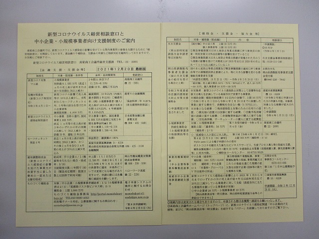 高梁商工会議所では、新型コロナウイルスの影響を受けている中小企業・小規模事業者の皆様向けに融資や雇用調整助成金、小規模事業者持続化補助金、岡山県飲食店等一時支援金、時短要請協力金をはじめ国・県・市等の支援制度内容をまとめたパンフレットを作成し、全会員の皆様へ配布しています。支援制度については、支援制度内容、そして新しい制度の創設や公募期間終了日など、最新の支援制度の内容を紹介するため令和2年4月から毎月作成しており、12月号(最新版)は令和3年12月20日に発行、最新の各種支援制度をPRしています。高梁市中小企業等事業継続支援金、令和3年1月から9月のいずれかの月の売上高が前々年又は前年同月比で20%以上減少している事業者に対して支給(高梁市内に主たる事業所を置いている事業者が対象)で、中小企業者20万円・小規模事業者10万円。但し「岡山県飲食店等一時支援金、岡山県時短要請協力金等」との併給はできません。申請期限は令和3年12月28日。小規模事業者持続化補助金(一般枠)第7回締切は令和4年2月4日、同「低感染リスク型ビジネス枠」、第5回締切は令和4年1月12日となっています。また、コロナ感染防止対策として設備等を改修又は導入を計画している高梁市内で営業する事業者を対象に(補助金額:補助対象経費の1/2以内の金額で、上限10万円)とした、令和3年度「高梁市店舗内感染拡大防止対策支援補助金」、ものづくり補助金、月次支援金、事業再構築補助金を掲載しています。尚、高梁商工会議所「経営相談窓口」では各種支援制度の相談をお受けしていますのでお気軽にご相談ください。同時に、専門家による個別相談日も設けておりますので合わせてご相談ください。