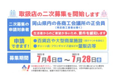 前の記事:« 商工会議所等運営の商取引支援サイト「ザ・ビジネスモール」に登録しています 次の記事:岡山県小規模事業者事業継続力強化補助金(BCP補助金)のご案内 »
