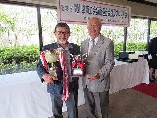 第38回岡山県商工会議所連合会議員ゴルフ大会が、5月14日(火)に瀬戸大橋カントリークラブ(玉野商工会議所主管)で開催されましした。大会には県下12商工会議所から82人が参加、高梁商工会議所から藤岡会頭をはじめ8人が参加しました。競技の結果、個人の部では、高梁商工会議所常議員の江草昌平氏が優勝され、主管された玉野商工会議所三宅会頭から、優勝カップと記念品が贈られました。