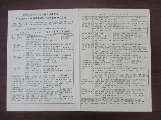 高梁商工会議所では、新型コロナウイルスの影響を受けている中小企業・小規模事業者の皆様向けに融資や雇用調整助成金、小規模事業者持続化補助金、岡山県飲食店等一時支援金、時短要請協力金をはじめ国・県・市等の支援制度内容をまとめたパンフレットを作成し、全会員の皆様へ配布しています。支援制度については、支援制度内容、そして新し制度の創設や公募期間終了日など、最新の支援制度の内容を紹介するため令和2年4月から毎月作成しており、7月号(最新版)は令和3年7月21日に発行、最新の各種支援制度をPRしています。岡山県全域への「緊急事態措置」が延長(6月1日~6月20日)されたことに伴う(第3期)「岡山県時短要請協力金」(申請期限8月20日)。また、(第2期)「岡山県飲食店等一時支援金」、対象は令和元年比又は令和2年比で令和3年の4月、5月又は6月の売り上げが30%以上減少している飲食店及び、飲食店への直接間接の取引のある事業者等となっています。申請は7月30日開始。そして、小規模事業者持続化補助金(一般枠)第6回締切は10月1日、同「低感染リスク型ビジネス枠」、第3回締切は9月8日、第4回締切は11月10日となっています。また、コロナ感染防止対策として設備等を改修又は導入を計画している高梁市内で営業する事業者を対象に(補助金額:補助対象経費の1/2以内の金額で、上限10万円)とした、令和3年度「高梁市店舗内感染拡大防止対策支援補助金」他を掲載しています。尚、高梁商工会議所「経営相談窓口」では各種支援制度の相談をお受けしていますのでお気軽にご相談ください。同時に、専門家による個別相談日も設けておりますので合わせてご相談ください。