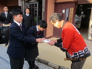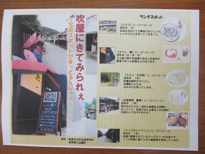 高梁商工会議所がコーディネーター(申請者)となり、高梁市立宇治高校と連携し、高梁川流域未来人材育成事業の採択を受け、高校生キャリア実践講座(吹屋観光マップの作成・吹屋観光グッズの作成)を実施しました。備中松山城だけではなく、吹屋地域にも観光客に足を運んでいただけるように成羽町観光協会吹屋支部と連携を図りながら、生徒自身が地域の魅力について考え、地域貢献のための活動や将来、地元で働く意義について考えることを目的に同事業を実施しました。吹屋観光協会の方にレクチャーを受け、研究することから取り組み、行き帰り吹屋の定期バスを利用することを想定し、吹屋ふるさと村の見どころや飲食店などをまとめたA4版2つ折りマップ「吹屋にきてみられぇ」を作成しました。1月17日(金)午後4時から高梁市成羽地域局吹屋連携事務所前で行われた贈呈式には、宇治高校関係者、高梁市商工観光課、高梁商工会議所が出席、宇治高校生2名から同協会吹屋支部加藤支部長にマップが贈呈されました。