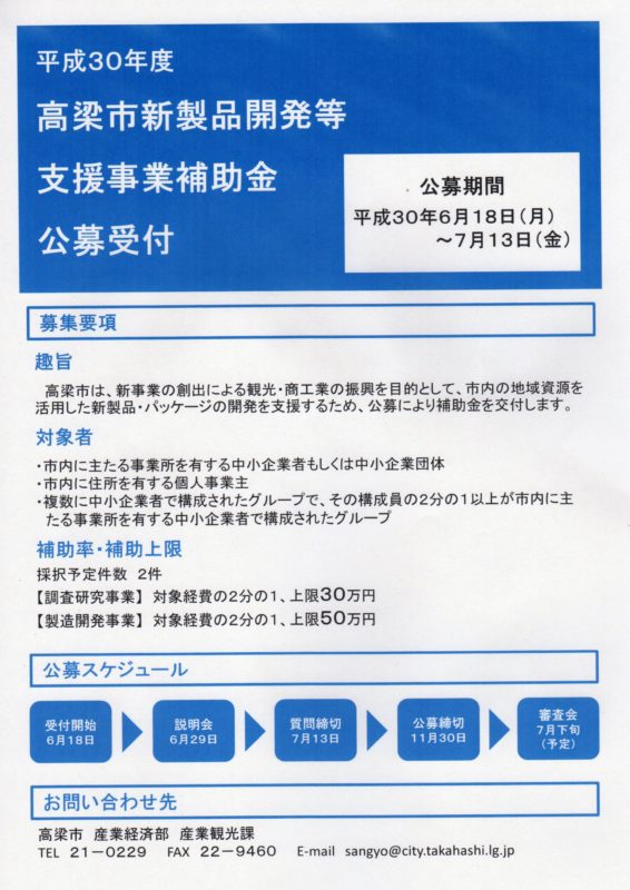 平成30年度高梁市新製品開発等支援事業補助金公募のご案内