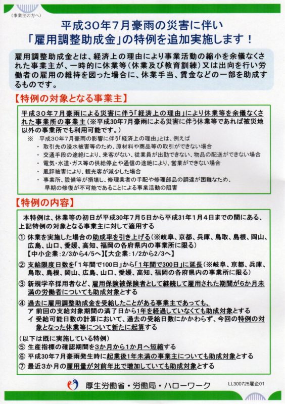 > 7月豪雨災害に伴う「雇用調整助成金」特追加実施(適用は平成30年10月16日まで)