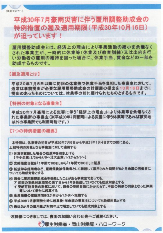 7月豪雨災害に伴う「雇用調整助成金」特追加実施(適用は平成30年10月16日まで)