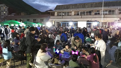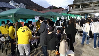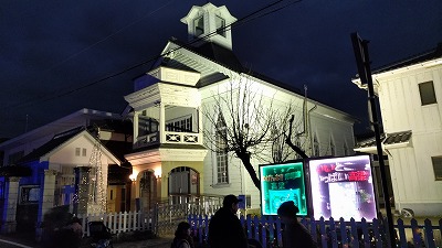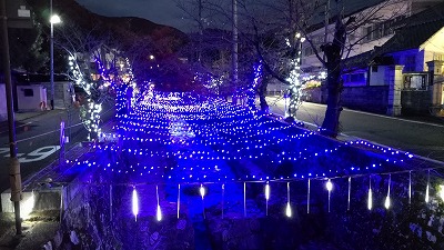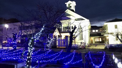 高梁市青年経済協議会(土井治会長)では11月25日(土)に紺屋町地区で「愛らぶ高梁ウインターマルシェ2023」を実施いたしました。メイン会場の高梁幼稚園で午後5時に開会式があり、同青年経済協議会、高梁商工会議所青年部、(一社)高梁青年会議所、備北商工会青年部などによる、おでん、焼き鳥、イカ焼き、たこ焼き、カラフル綿菓子など販売のテントが並びました。紺屋川一帯約150メートルの区間では両岸の樹木を白と青色のLEDで飾り、高梁基督教会堂がライトアップされ、教会堂周辺の区間には紺屋川の上にLEDを張り巡らしています。また県立高梁城南高等学校電気科が作成したパネルも設置されました。同日に点灯式が行われ、午後7時30分には高梁川では花火が打ち上げられました。イルミネーションは令和6年1月14日(午後5時~午後9時)まで点灯されます、冬の風物詩・紺屋川イルミネーションをお楽しみください。