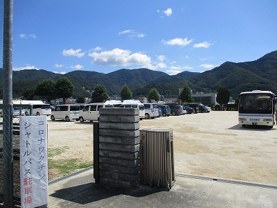 また同大学接種会場付近に駐車場が少ないため、高梁商工会議所と備北商工会では高梁小学校グラウンドに臨時駐車場を設置(大学と臨時駐車場に職員4人配置)し、シャトルバスで送迎しました。