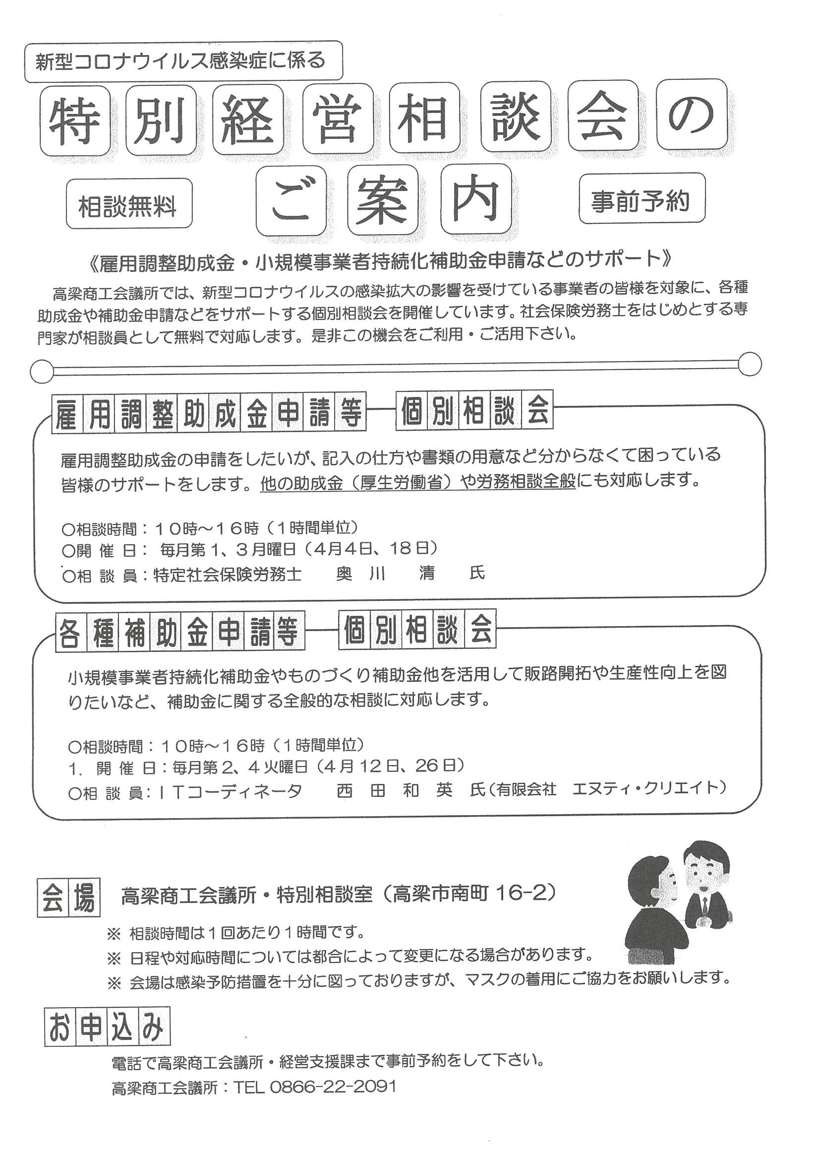 新型コロナ特別相談会(無料相談・4月)のご案内(高梁商工会議所)