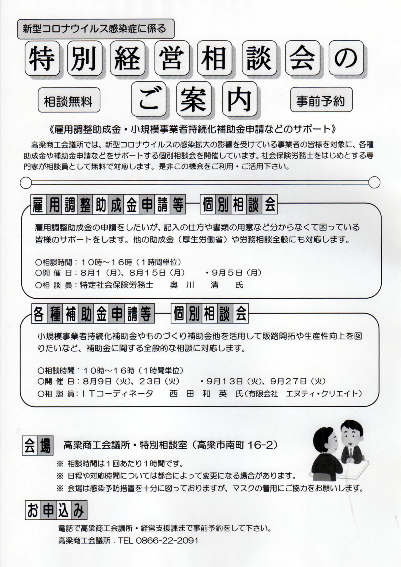 > 新型コロナ特別経営相談会「無料相談 8月・9月」のご案内(高梁商工会議所)