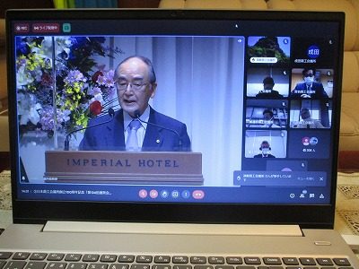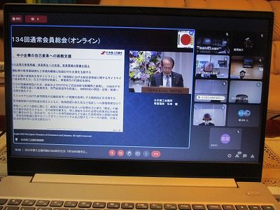 日本商工会議所第134回通常会員総会が、3月17日(木)午後2時30分から、ハイブリッド形式で開催されました。会員総会には全国515商工会議所がリアル及びオンラインで参加、高梁商工会議所からはオンライン参加いたしました。会員総会では三村会頭の挨拶の後、来賓挨拶として岸田内閣総理大臣、萩生田経済産業大臣のビデオメッセージなどがありました。続いて表彰が行われ、優良商工会議所並びに永年勤続役員議員・職員表彰が行われました。続いて議事に入り、①2022年度事業計画(案)について、②2022年度収支予算(案)について説明があり、すべて承認されました。