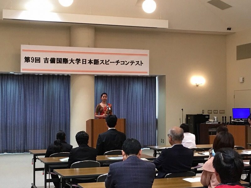 吉備国際大学では、第9回日本語スピーチコンテストを、1月20日(土)順正学園国際交流会館で開催され、最優秀の総長賞にスリランカからの留学生で経営社会学科2年のアラワッタゲ トゥシャーリ マドゥシャーニさんが選ばれました。トゥシャーリさんは、「日本とスリランカの架け橋になる」というサブタイトルでスピーチし、自国の伝統、文化を大切にした上で外国の伝統、文化を理解することの重要さを訴えました。コンテストは、スリランカの他、中国、台湾、韓国、ベトナム、インドネシアからの吉備国際大学留学生と岡山県共生高校(新見市)に通う12人が「私にとってのグローバル化」をテーマに発表し、眞山滋志学長、高梁商工会議所島副会頭、高梁学生応援協力会田中会長ら5人の審査員が発音、文法、表現力、内容を基準に審査しました。