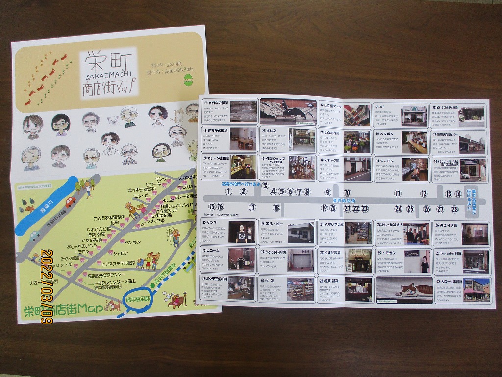 高梁栄町商店街振興組合では、高梁市立高梁中学校と連携し商店街マップを作成いたしました。高梁中学校3年生の生徒が「地域貢献プロジェックト」として、栄町商店街にどのような店舗があり、どういったものが売られているのかを実際に取材しました。そして、取材した内容をもとに店舗の写真や紹介文、マップのイラストすべてのデザインを生徒自身が作成しました。同マップは「高梁市市民提案型まちづくり支援事業」の一環として作成(印刷)し、高梁市図書館、JR備中高梁駅、観光交流センター、高梁商工会議所等にも設置しています。