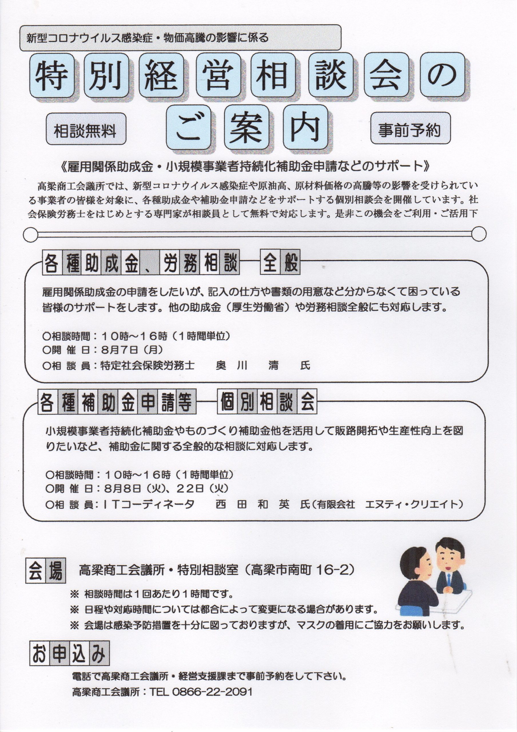 特別経営相談会「無料相談8月」のご案内(高梁商工会議所)