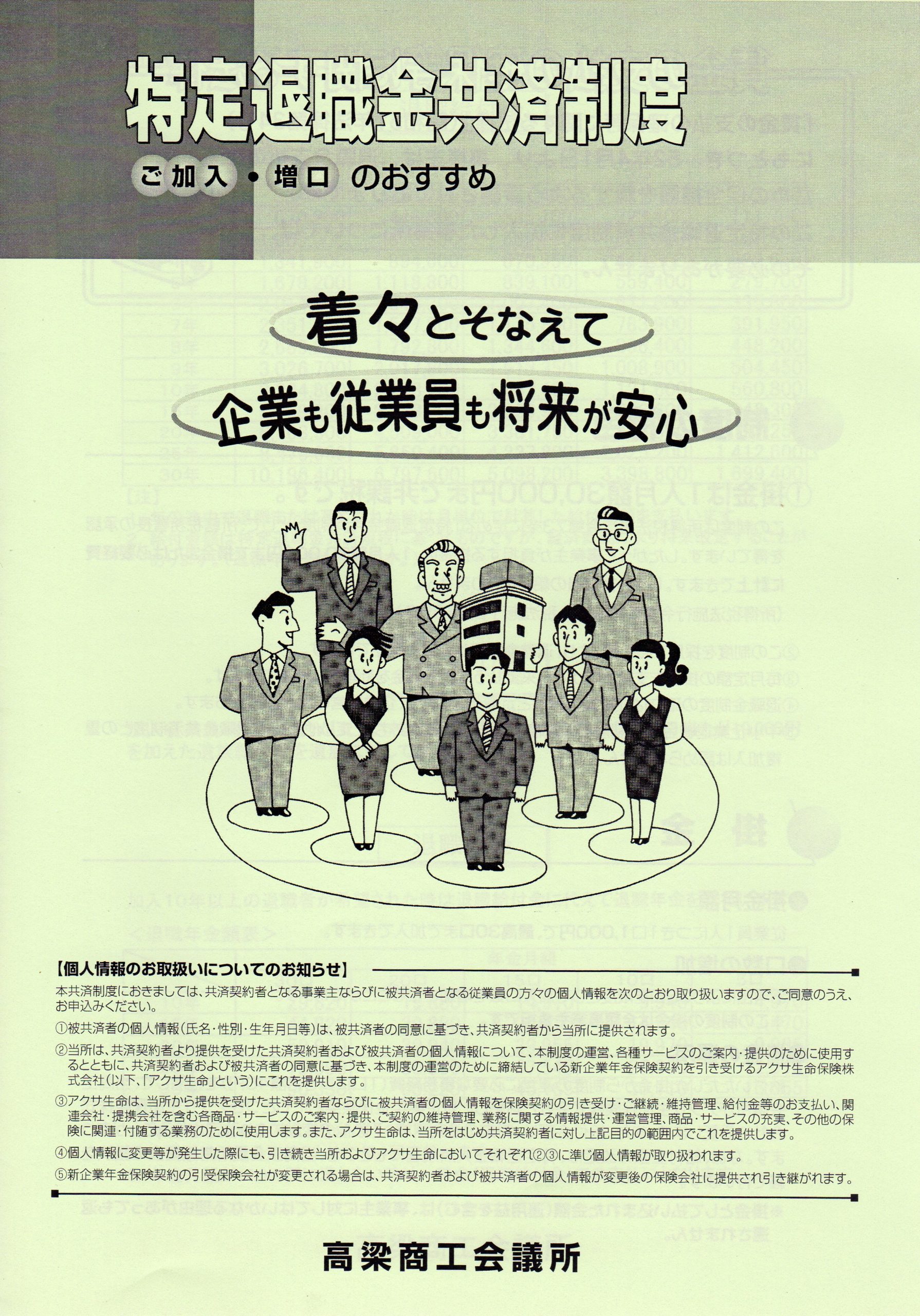 高梁商工会議所では、会員事業所の退職金制度確立のためアクサ生命保険㈱と事務委託契約を締結し、「高梁商工会議所特定退職金制度」の運営を行っています。この制度は、所得税法施行令第73条に定める「特定退職金共済制度」として、所轄税務署長の承認を得ており、事業主が負担する掛け金は1人月額30,000円まで損金または必要経費に計上できます。この制度を採用することにより、退職金制度が容易に確立すると共に、毎月定額の掛け金を支払うだけで将来支払うべき退職金を計画的に準備でき、従業員の確保と定着化をはかるなど企業経営に役立てていただいています。特定退職金制度の詳細につきましては、当商工会議所総務企画課までお問い合わせ下さい。