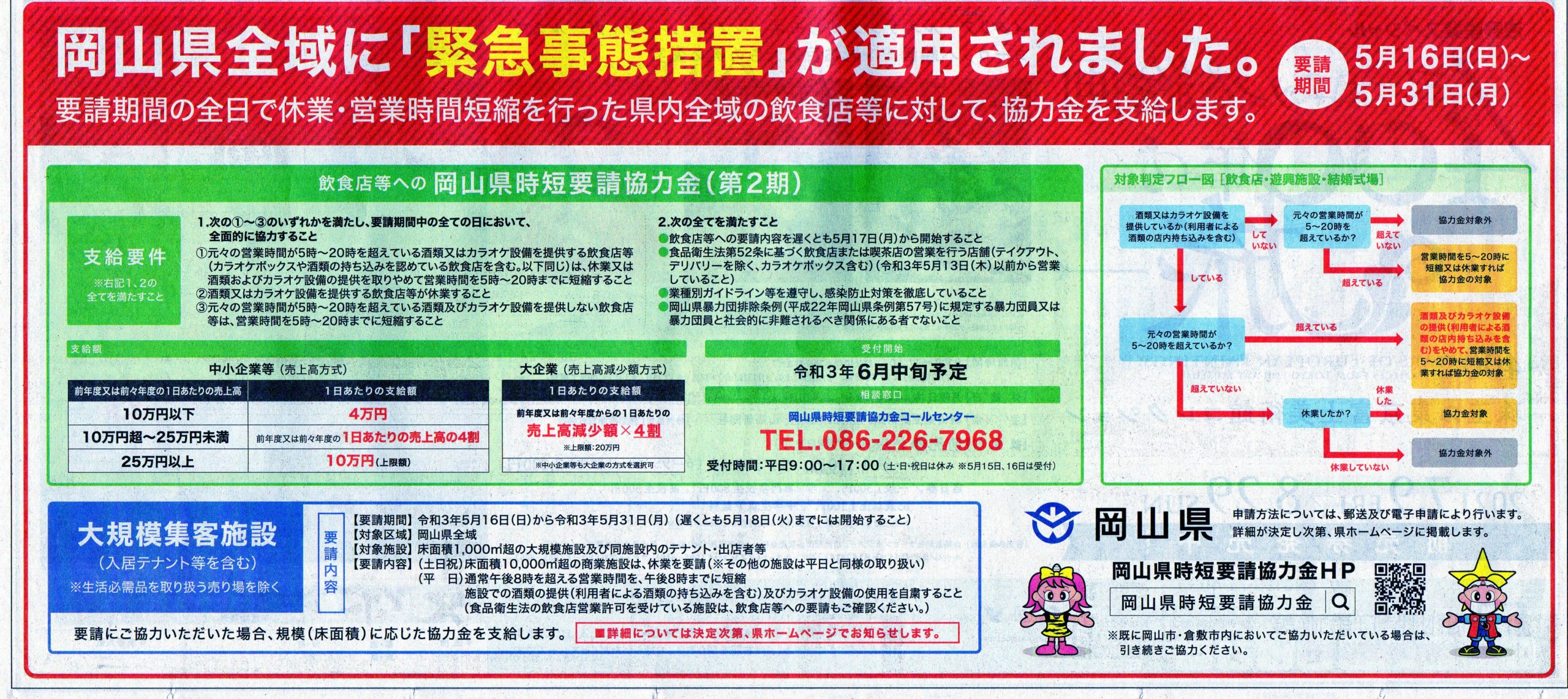 岡山県時短要請協力金(第2期:5月14日~5月31日)について – 岡山県ホームページ(産業企画課) (pref.okayama.jp)