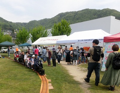 高梁商工会議所落合町支部(三宅善行支部長)では4月22日(日)に、第7回落合ふれあい公園まつりを開催いたしました。初めての試みとなった「しりとりレスリング」の他、「ソフトグライダー」、「ビンゴゲーム大会」、「ミニSL」、「子供神楽」、「ミンティアダンスショー」、「まゆみゆミニライブ」、「ぢゃぐりぃけいたぱふぉーまんすしょー」など様々な行事を開催し、雲ひとつ無い青空の下、多くの人出で会場は盛り上がりました。また、フードコーナーではインディアントマト焼そば(備中高梁食援隊)、高梁ラーメン(DO‐RA)の他、秋岡商店、藤原商事などが出店し、多くのお客様で賑わいまし