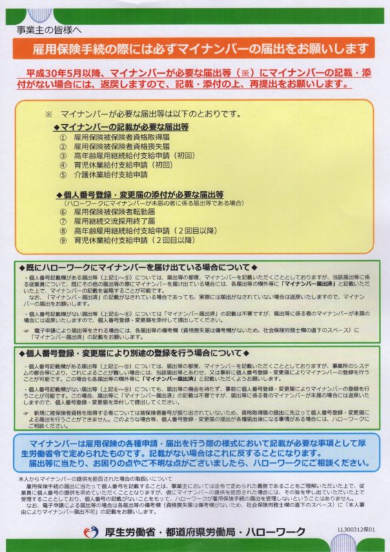 雇用保険手続きの際には必ずマイナンバーの届け出をお願いします