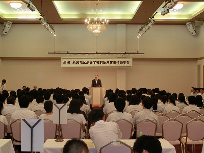 高梁・新見地区「高等学校対象産業事情説明会」を、7月26日(木)午後1時30分から、高梁国際ホテルで開催いたしました。産業事情説明会は、管内の産業事情及び求人状況の説明を行い新規高等学校卒業者の高梁地域への就職を促進することを目的に、高梁・新見地区雇用開発協会、高梁・新見商工会議所、高梁公共職業安定所、同新見出張所主催により、毎年(高梁市・新見市隔年)開催しています。説明会では、高等学校教諭、生徒、企業関係者(22社)、主催者含め約170人が出席、高梁地区雇用開発協会柴倉会長の挨拶の後、高梁公共職業安定所丸山所長が雇用情勢について説明されました。そして管内参加企業の担当者が、来春卒業予定の高校生に企業概況説明した後、各社のブースで補足説明が行われた。また、「就職内定を勝ち取る面接対応」をテーマとした講演も行なわれました。