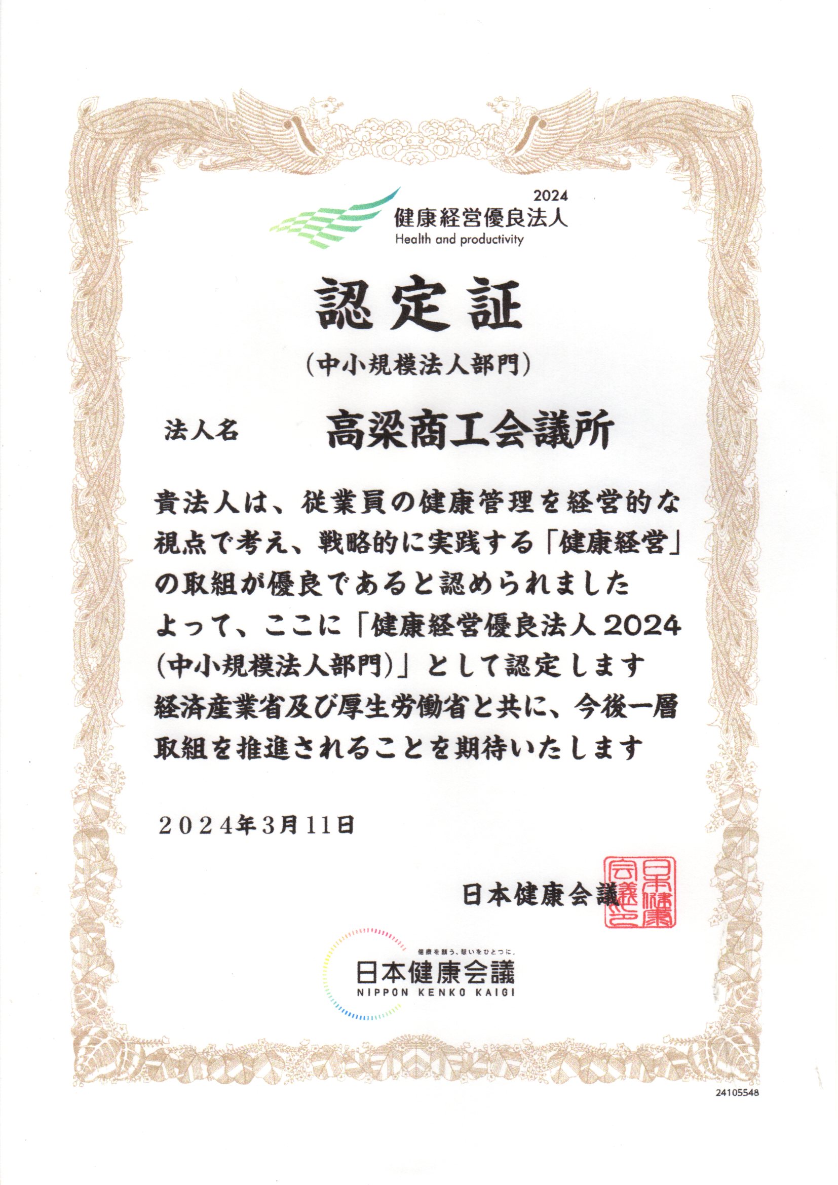 高梁商工会議所が「健康経営優良法人2024」の認定を受けました