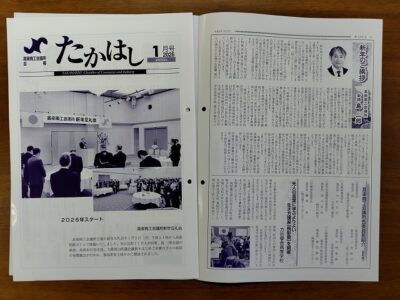 高梁商工会議所会報1月号が発行されました。表紙は、1月5日(月)に高梁国際ホテルで開催した高梁商工会議所「新年互礼会」開催報告、2p以降に高梁商工会議所島会頭新年挨拶文、高梁市石田市長挨拶文、(一社)高梁青年会議所赤木理事長就任挨拶文、高梁商工会議所各委員長紹介、方谷学舎高等学校で開催されている、先人の言葉に学ぶよりよい生き方講座「飛彰塾」紹介などです。会員事業所紹介は「カフェなかお(高梁市中井町津々)」、吉備国際大学地域連携・地域貢献活動報告会開催案内、ビジネス総合保険等「商工会議所会員向け保険制度」案内、申告と納付期限案内(高梁税務署)等を掲載。またマルケイ資金案内、特別経営相談会○「雇用関係助成金個別相談会(随時・要予約)・1社1時間)」、○「特許・商標・実用新案・意匠相談日」(高梁商工会議所主催)2月開催案内、広報委員会だより(委員紹介等)、編集後記などです。またご覧ください。