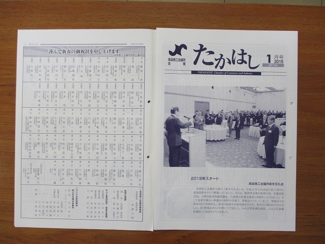 高梁商工会議所会報1月号が発行されました。表紙は、1月4日に高梁国際ホテルで開催した新年互礼会。2P以降に、藤岡会頭新年挨拶文、高梁商工会議所役員・議員名簿、事務局職員名簿、アクサ生命備中営業所社員名簿、ライオンズクラブ主催第31回体力づくりなわとび大会、(一社)高梁青年会議所西理事長挨拶文、高梁税務署と高梁商工会議所との連絡会議報告、高梁ふれあいカード会初詣招待旅行報告、確定申告PR等です。女性会だよりは、花の寄せ植え講習会開催報告、高梁商工会議所新年互礼会参加報告です。また「学生等コラム」、平成30年7月豪雨関連情報(被災事業者用り災証明発行受付期限について、所得税及び復興特別所得税関係等、高梁商工会議所特別相談窓口について)、特許相談日案内、編集後記、マルケイ資金案内、事務局日誌等です。吉備国際大学外国語学部高橋ゼミと連携した取材「産学連携シリーズ」は、㈲岡﨑商店④です。またご覧下さい。