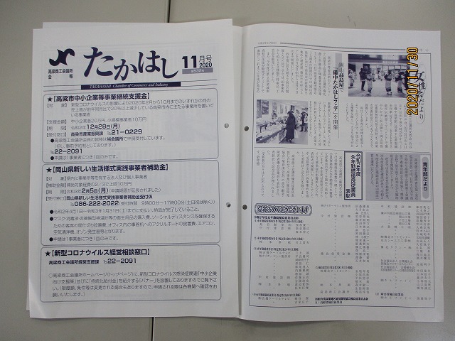 高梁商工会議所会報11月号が発行されました。表紙は、そして高梁市中小企業等事業継続支援金案内(申請期限・令和2年12月28日迄、高梁商工会議所で申請受付窓口実施中)並びに岡山県新しい生活様式実践事業者補助金(申請期限・令和3年2月5日まで延長)の案内について、そして高梁商工会議所新型コロナウイルス「経営相談窓口」案内。2p以降に、岡山高島屋で開催した「備中高梁フェア(高梁市の特産品販売・10月28日~11月3日)」(主催・高梁市特産品創出ネットワーク『高梁市・高梁商工会議所・備北商工会・備北広域農業普及指導センター・(一社)高梁市観光協会、JA晴れの国岡山』開催報告、今年度は県立高梁城南高校生も参加。「WEST EXPRESS 銀河」がJR備中高梁駅(伯備線)へ週2回停車している中、10月31日(水)及び11月7日(土)午後9時25分から歓迎ミニイベントとして、高梁市図書館前三の丸テラスや備中高梁駅ホームで当商工会議所女性会が「備中松山踊り」を実施報告。高梁商工会議所青年部(金石弘志会長)臨時総会開催報告(11月7日(木)午後7時30分、高梁商工会館)。令和2年度高梁商工会議所「永年勤続優良従業員表彰」並びに高梁地区雇用開発協会「高齢者優良従業員表彰」報告(受賞者名簿掲載)などです。また新型コロナウイルス感染症の影響に係る特別経営相談会①「雇用調整助成金個別相談会(毎週月曜日・1社1時間)」、②各種補助金に係る個別相談会(12月15日、22日・1社1時間)」(高梁商工会議所主催)12月開催案内、そして働き方改革等個別相談会案内、高梁稲荷神社霜月大祭(12月6日(日)・主催 備中高梁稲荷神社)案内、城下町フェスタ2020「集めて学ぶさんじゅーろーカード・高梁回遊記」(主催・(一社)高梁市観光協会案)案内、小規模企業共済案内、そして編集後記などです。吉備国際大学社会学部高橋ゼミと連携した取材「産学連携シリーズ」は、鯉正酒造㈱代表取締役永井芳郎氏⑩です。またご覧ください。