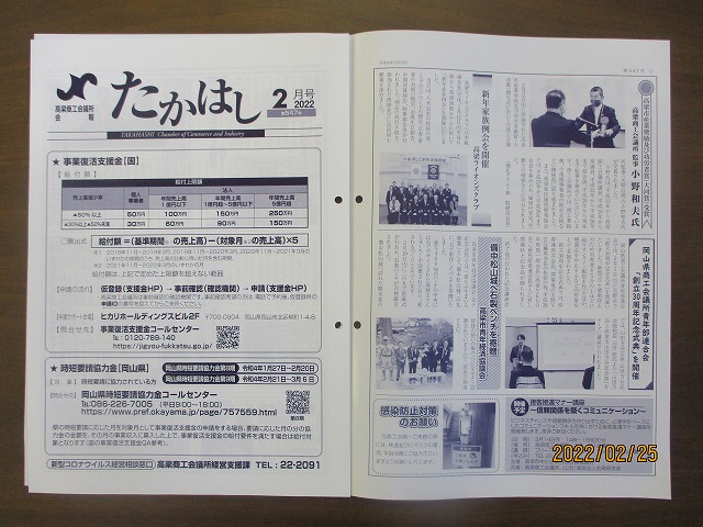 高梁商工会議所会報2月号が発行されました。表紙は、国の新型コロナ事業所支援施策の「事業復活支援金」案内。そして令和4年1月27日(木)から2月20日(日)の期間、岡山県に「まん延防止等重点措置」が適用されたことにより、要請期間の全日で、営業時間短縮等を行われた(協力金の対象となる)飲食店等に対しての「(第8期)岡山県時短要請協力金」並びに「まん延防止等重点措置」が2月21日(月)から3月6日(日)まで延長されたことに伴う「(第9期)岡山県時短要請協力金」案内。