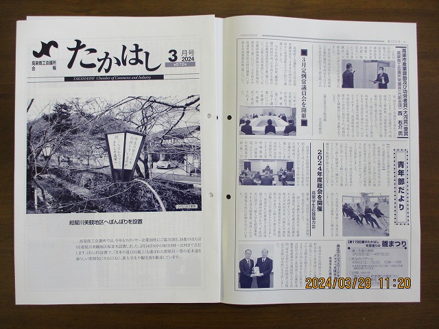 高梁商工会議所会報3月号が発行されました。表紙は、高梁商工会議所がスポンサー企業にご協力いただき、紺屋町美観地区の桜並木にボンボリを設置(18:00~21:00点灯)報告、2p以降に、高梁商工会議所3月定例常議員会開催報告、高梁学生応援協力会2024年度総会開催報告、順正デリシャスフードキッズクラブへ支援金贈呈(高梁学生応援協力会・高梁商工会議所)報告、吉備国際大学シャルム岡山高梁赤木圭GM寄稿文、「能登半島地震」義援金御礼、備中たかはし観光写真コンテスト(高梁市観光協会高梁支部)受賞者紹介、高梁商工会議所令和6年度検定試験案内、「第17回・町家通りの雛祭り」開催案内(4月6日、7日)などです。青年部だよりは、2月24日に岡山ドームで開催された「県青連大運動会」参加報告、そして令和6年度協会けんぽ岡山支部の保険料率改定案内、またマルケイ資金案内、物価高騰の影響に係る特別経営相談会①各種補助金に係る個別相談会(毎月1回(火曜日)予定・1社1時間)②「雇用関係各種助成金個別相談会」等(高梁商工会議所主催)4月開催案内、「特許・商標・実用新案・意匠相談日」案内、編集後記などです。またご覧ください。