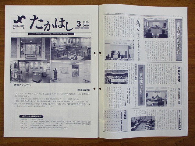 高梁商工会議所会報3月号が発行されました。表紙は、山田方谷記念館開館紹介。2P以降に、3月定例常議員会報告、高梁学生応援協力会総会開催報告、災害関連情報「高梁商工会議所復興グループ加入事業所・補助金交付決定状況報告」、大阪学院大学田中教授をお招きしてのチャレンジ経済塾(商店会連合会主催)報告、びしん経営者クラブ経営セミナー開催(新見)報告、高梁商工会議所平成31年度検定試験案内、働き方関連法案順次施行、事業継続計画(BCP)策定セミナー開催案内、福祉制度キャンペーン案内、アクサ生命広告、(一社)高梁青年会議所新執行部紹介、落合ふれあい公園祭り開催案内、グループ補助金申請に対する個別相談日のご案内、町家通りの雛まつり開催案内、新入会員紹介です。女性会だよりは、経営セミナー「おもてなしの極意」開催報告、青年部だよりは視察研修卒業旅行報告、県青連新会員オリエンテーション参加報告です。また「学生等コラム」、特許相談日案内、編集後記、マルケイ資金案内、事務局日誌等です。吉備国際大学外国語学部高橋ゼミと連携した取材「産学連携シリーズ」は、㈲岡﨑商店⑥です。またご覧下さい。