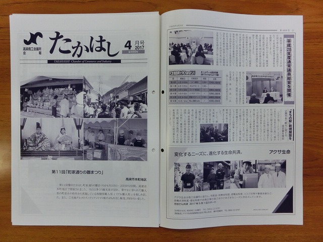 高梁商工会議所会報4月号が発行されました。表紙は、第11回備中高梁城下町「町家通りの雛祭り」。2p以降に、高梁商工会議所通常議員総会報告、近藤高梁市長へ観光に関する提言書を提出、歓迎看板などを設置した「新入学生歓迎事業」(高梁商工会議所・高梁学生応援協力会)、順正学園で行われた学生便利手帳並びに留学生生活支援物品贈呈式(高梁商工会議所・高梁学生応援協力会)、岡山県商工会議所連合会議員ゴルフ大会報告(高梁商工会議所第2位)、高梁ライオンズクラブ雛祭りへ参加、備北信用金庫新小学生へ文房具セットを贈呈などです。女性会だよりは、「親睦旅行」(倉敷市)と雛祭りへ参加報告です。